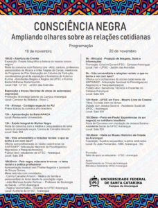 Além disso, durante a semana, entre 19/11 a 23/11 a biblioteca setorial do Campus Araranguá estará divulgando conteúdo sobre temas raciais em suas redes sociais. Salientamos que a temática racial deve ser discutida durante todo o ano na sociedade e nos espaços universitários. Recentemente a agência de comunicação da UFSC lançou o material intitulado “Consciência Negra” na série UFSC Explica, estimulando o debate institucional sobre o tema. Saiba mais aqui.